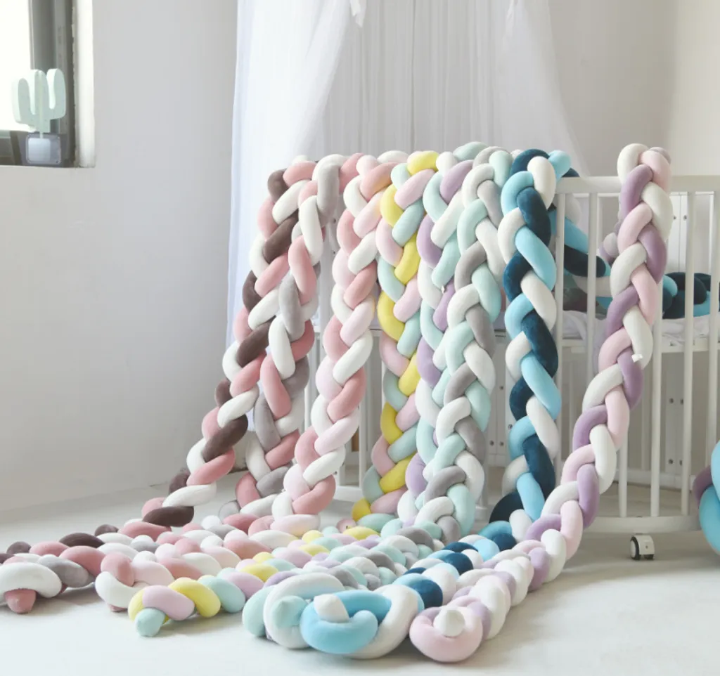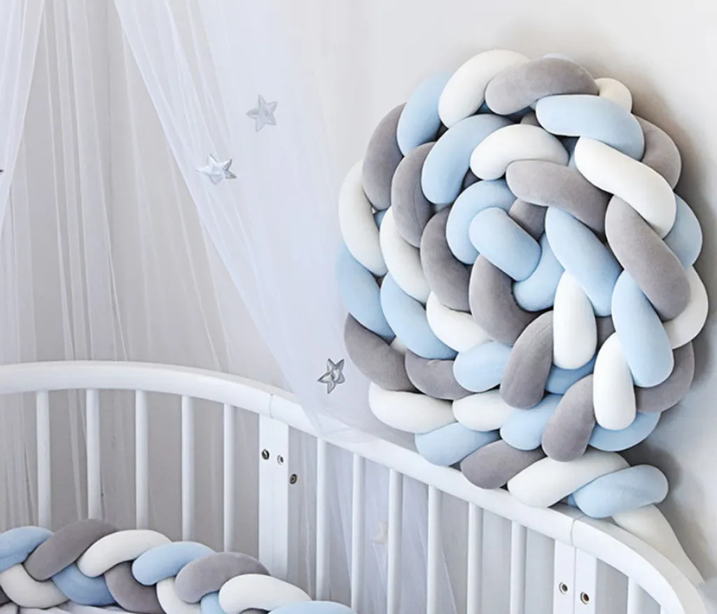 Bettschlange Geflochten Bettumrandung, Babybett Nestchen Stossfaenger Dekoration, Bettrolle Für Krippe Kinderbett 200CM Weiß+Grau+Blau