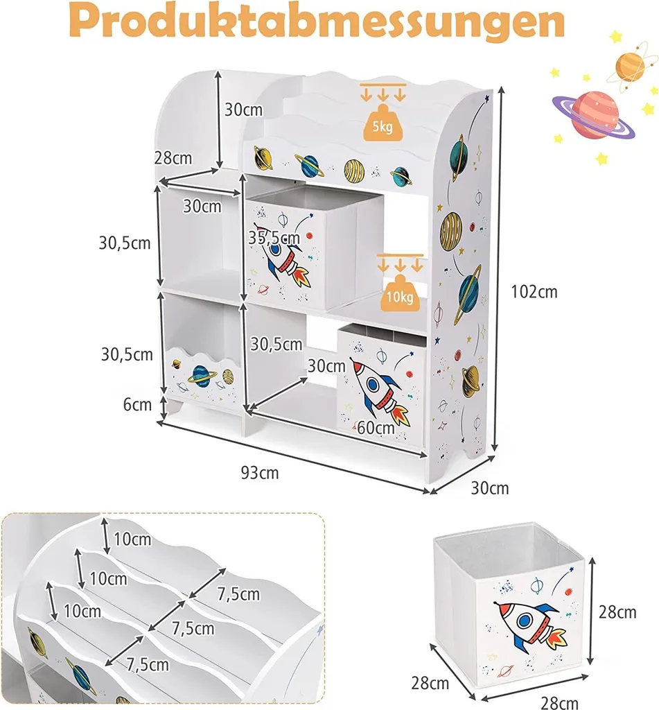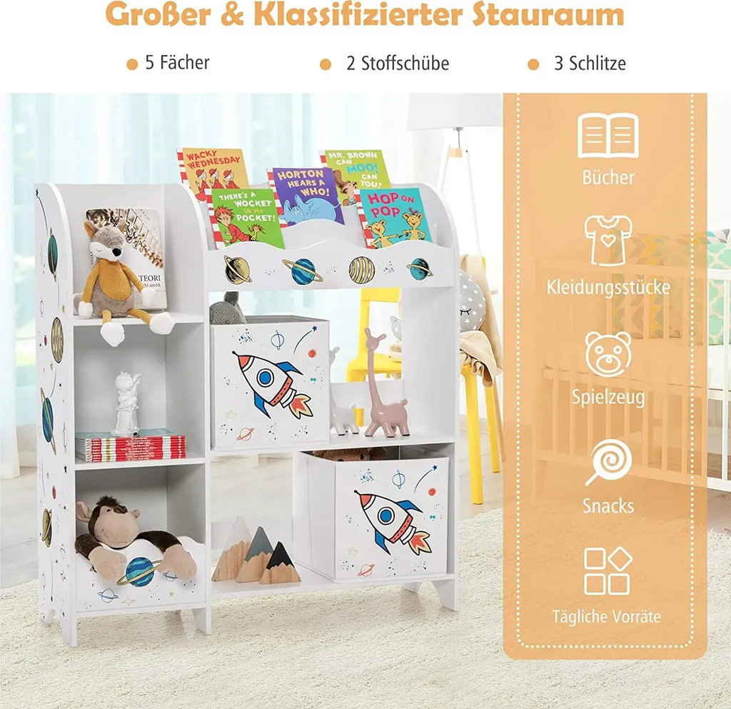 COSTWAY Freistehender Kinderzimmerschrank, 3-stöckiger Kinderzimmerregal, Spielzeug-Organizer Für Kleinkinder Mit 5 Fächern & 2 Aufbewahrungsboxen & 3 Regalen (Planetenrakete)