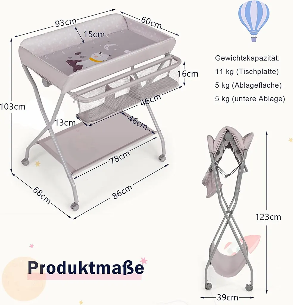 COSTWAY Wickeltisch Mit Großen Aufbewahrungsfläche Und -körben, Wickelkombination Klappbar & Rollbar, Wickelkombi Mit Sicherheitsgurt, Wickelregal Für Babys Und Kleinkinder Bis 11kg (Grau)