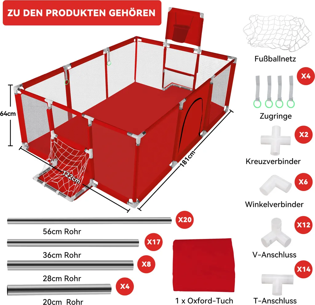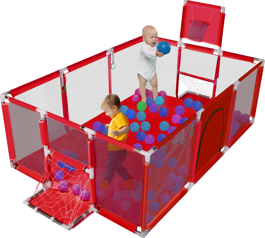 Laufstall Baby Laufgitter Schutzgitter Mit Basketball Box, Fußballbox Und Atmungsaktivem Netz, Stabiler Absperrgitter Für Kinder, Rot, 180x122cm