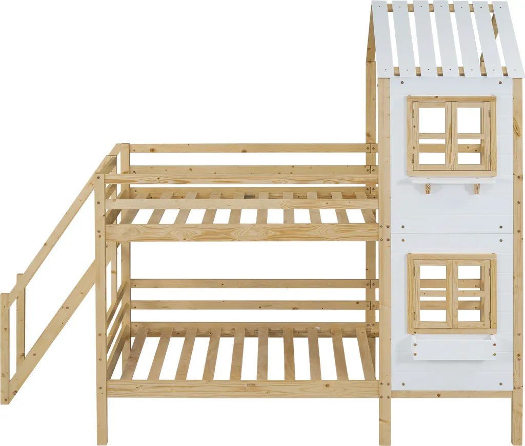 Merax Etagenbett 90x200cm Kinderbett Mit Leiter, Fallschutz Und Lattenrost, Hochbett Stockbett Kiefer Holzbett Hausbett Mit Dach Und Fenster, Weiß/Natur