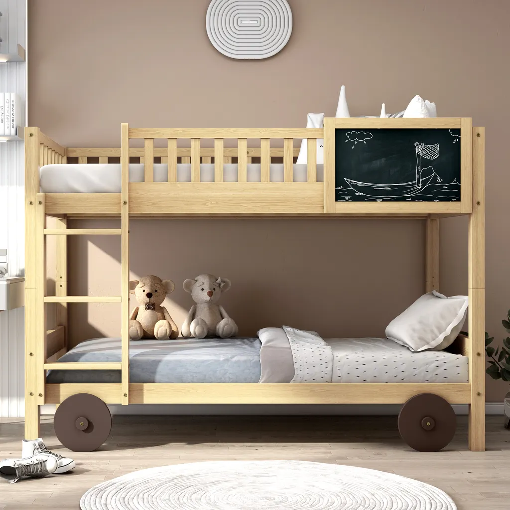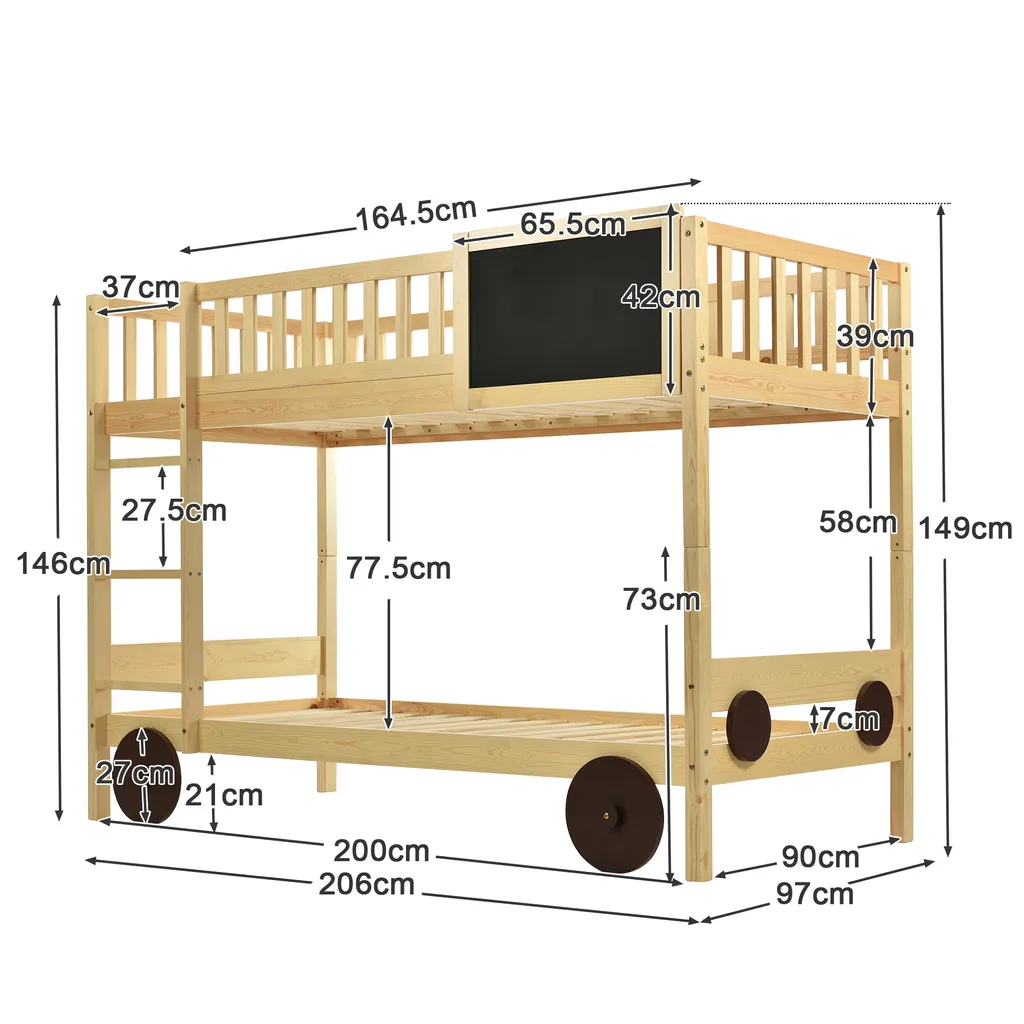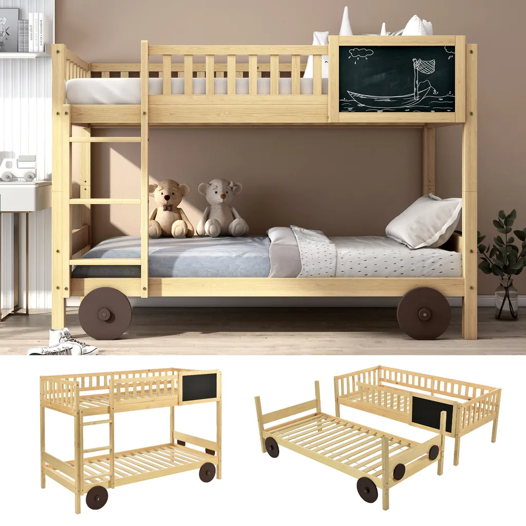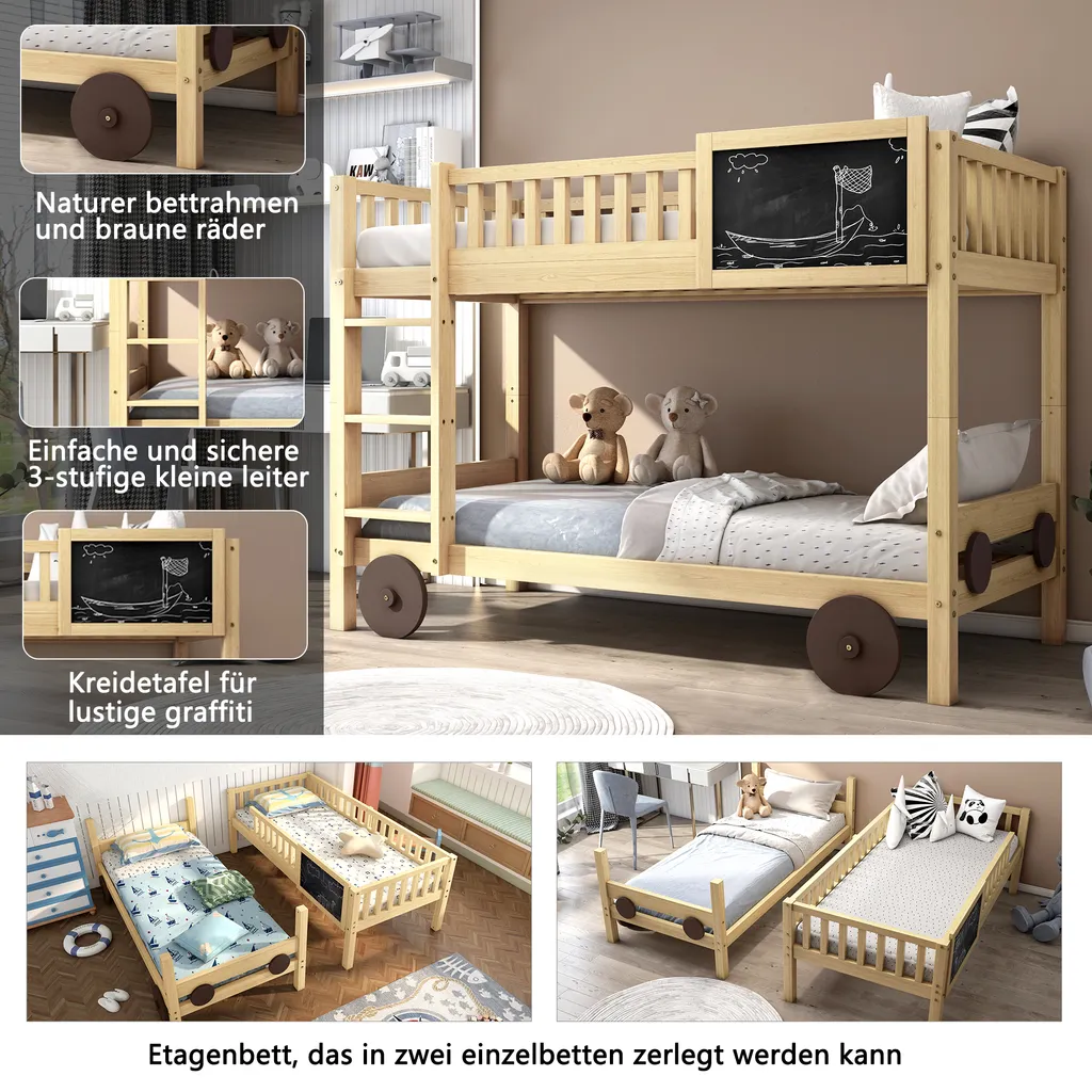 Merax Etagenbett 90x200cm Kinderbett Mit Rechtwinkliger Treppe Und Tafel, Zaun Und Rädern, Stockbett Rahmen Aus Kiefer, Teilbar Zu 2 Einzelbetten, Natur