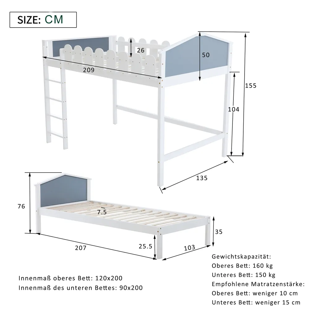 Merax Kinderbett 120 X 200/90 X 200 Cm Etagenbett Hochbett Mit Lattenrost, Spielbett Massiv Stock Kiefernbett Bett, Weiß