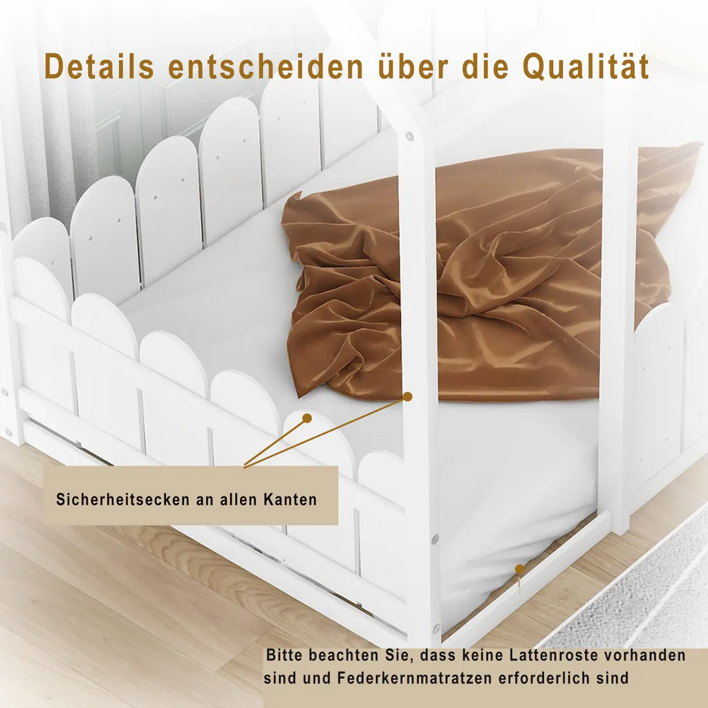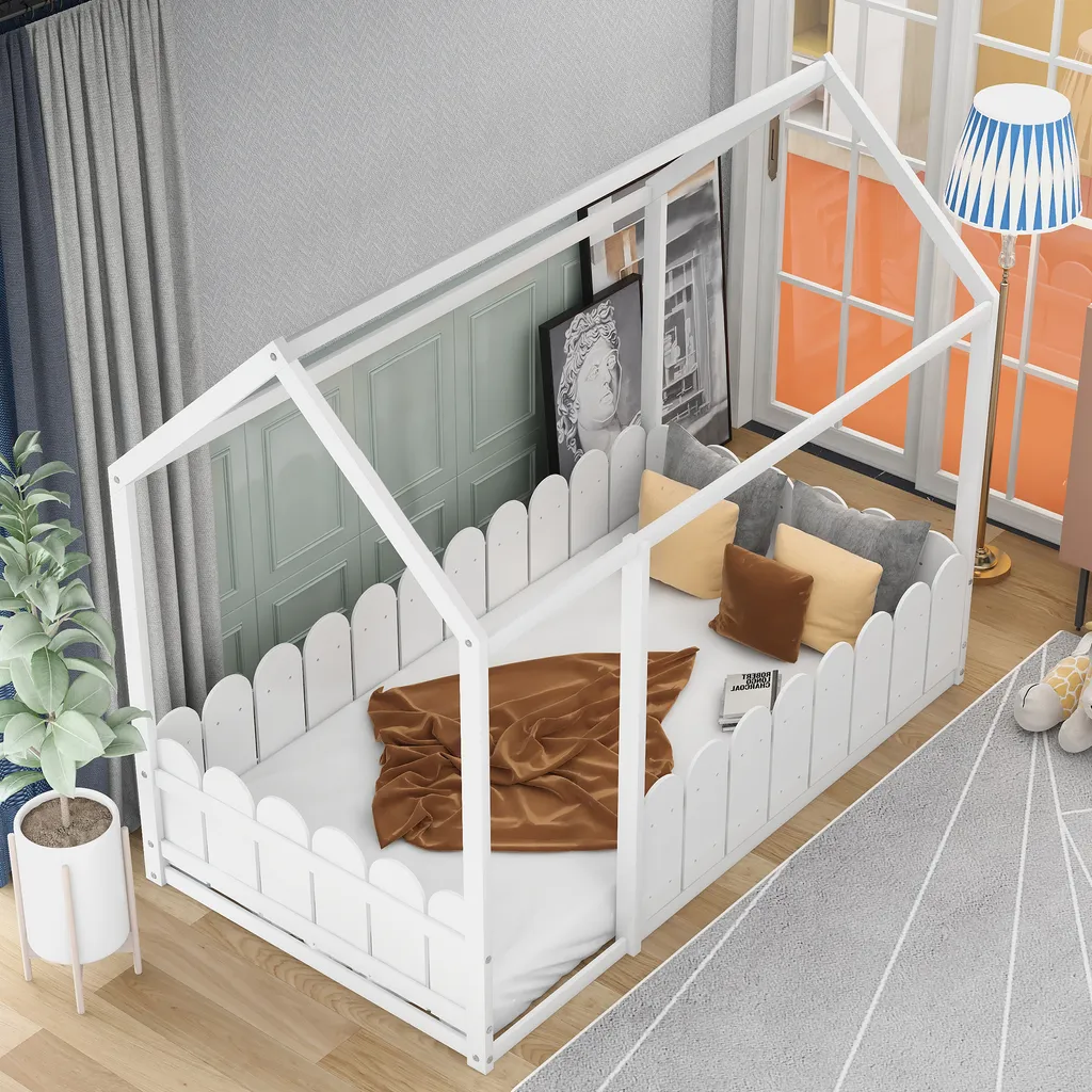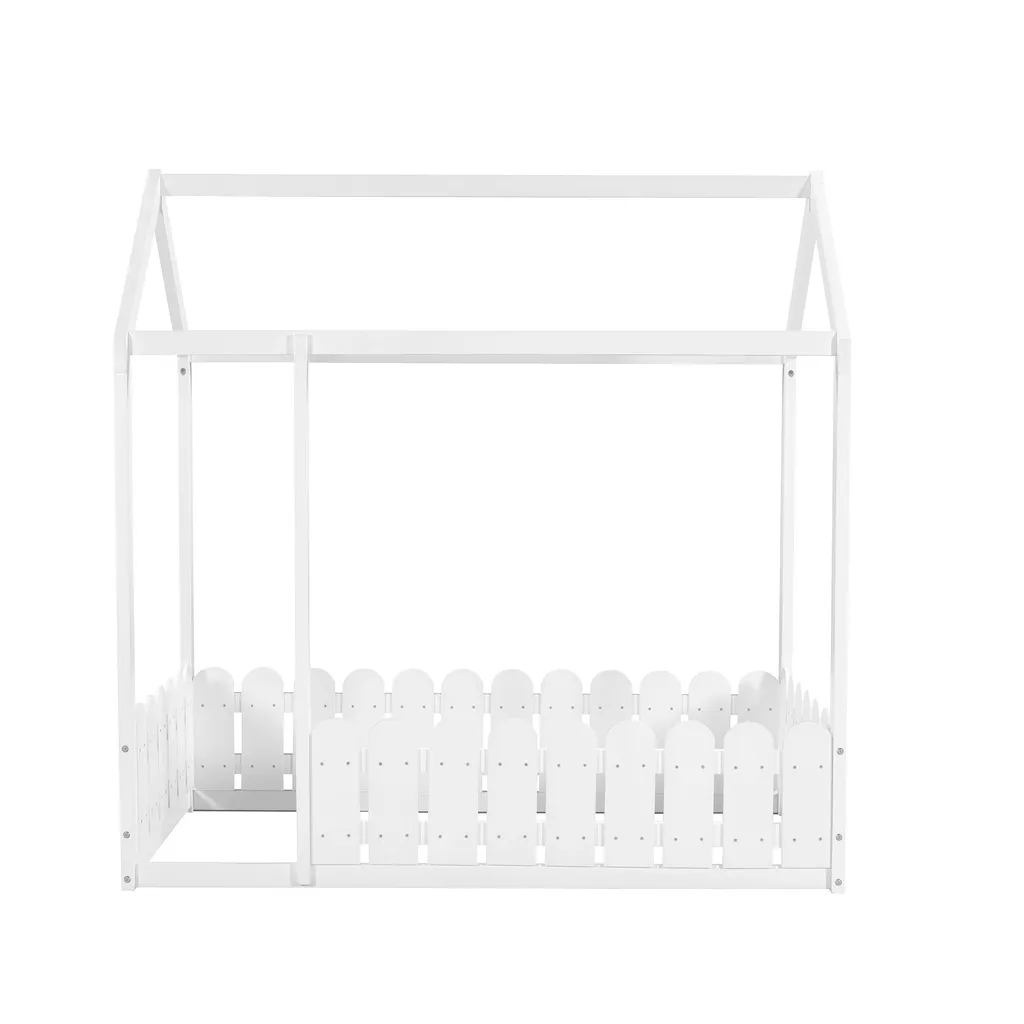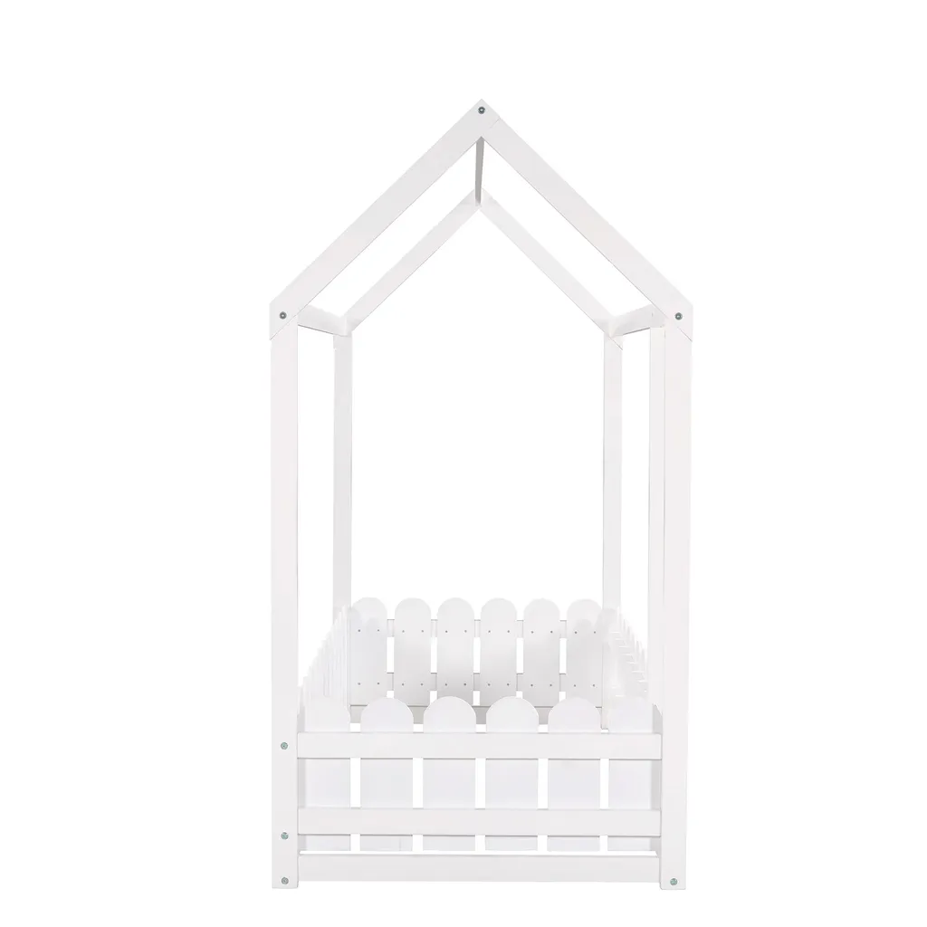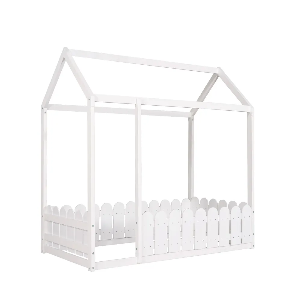 Merax Kinderbett 80x160cm Hausbett Mit Dach Und Zaun, Spielbett Einzelbett Aus Massivem Kiefernholz, Weiß