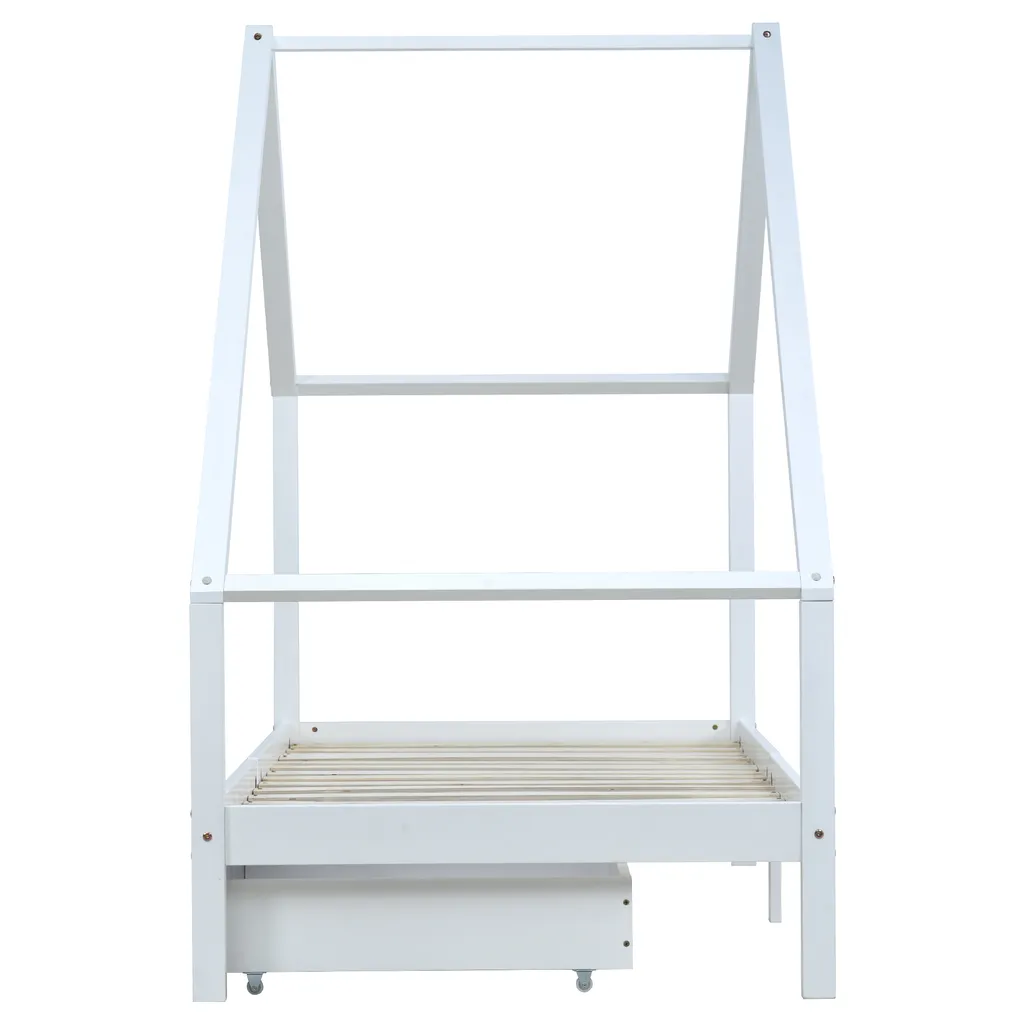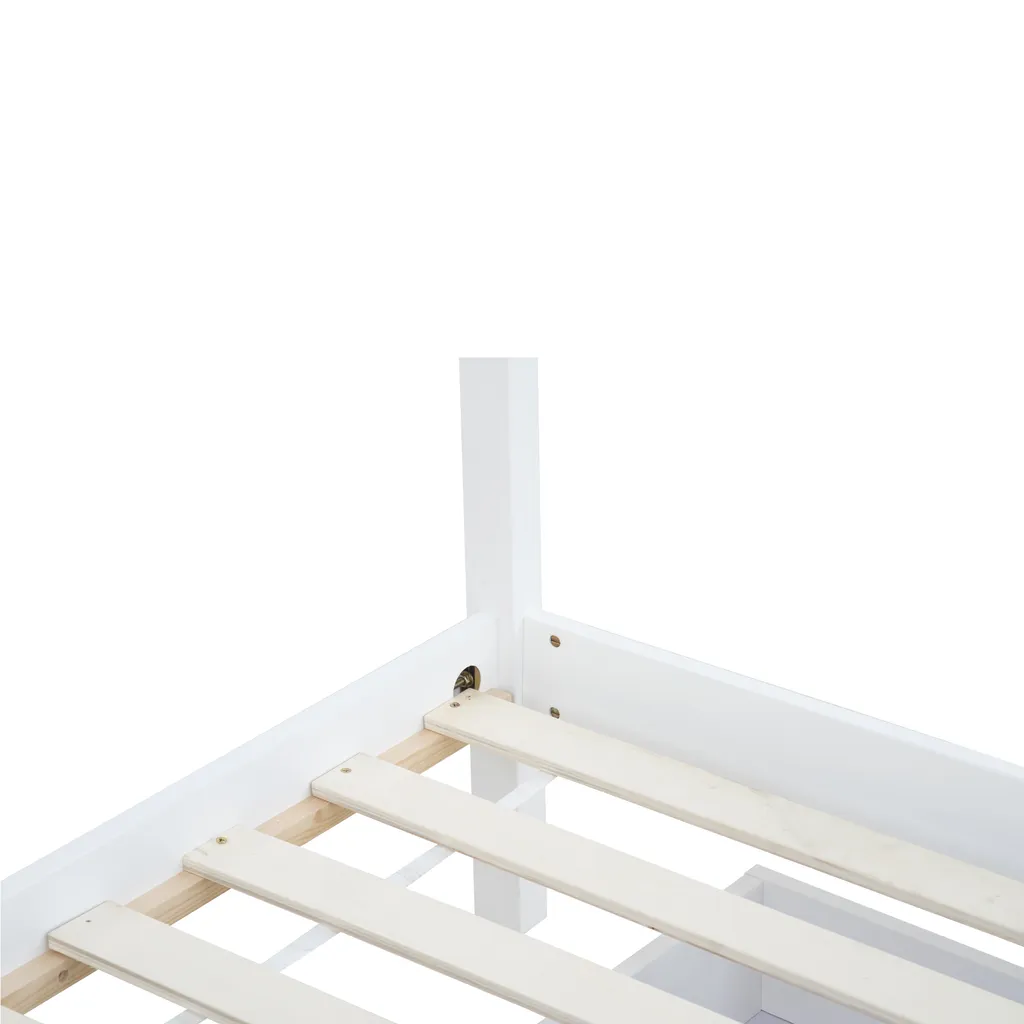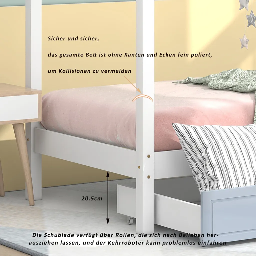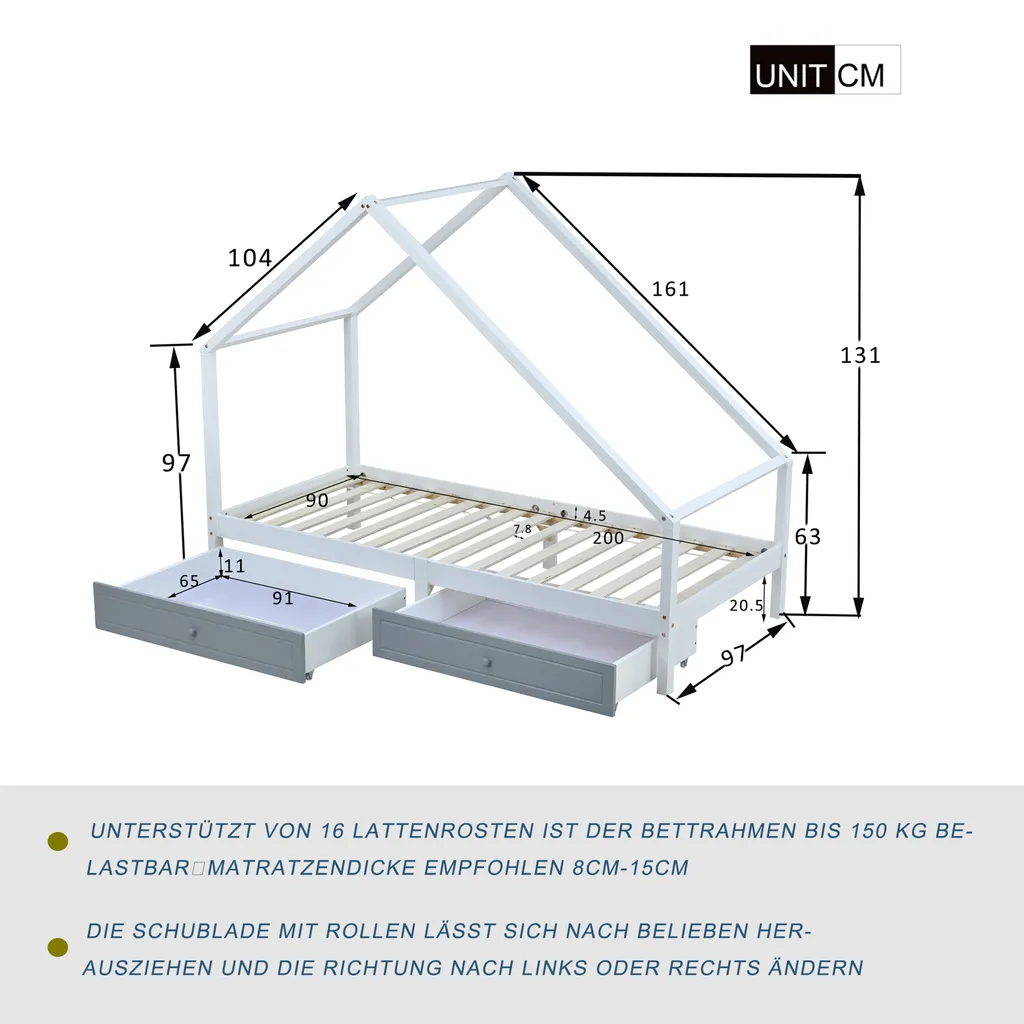Merax Kinderbett 90×200 Cm Hausbett Mit 2 Herausnehmbaren Schubladen, Stabiles Podestbett Jugendbett Spielbett Aus Kiefer, Weiß