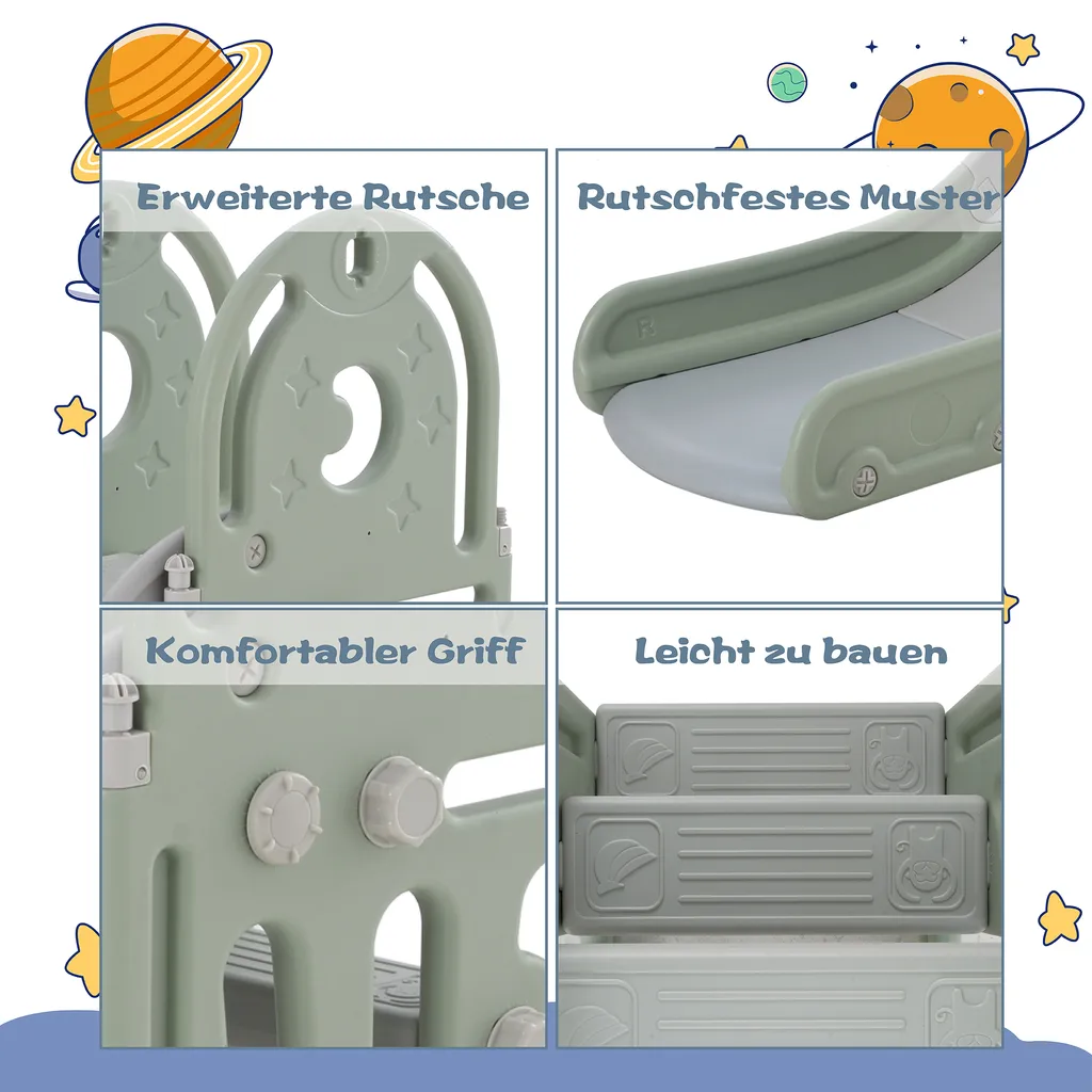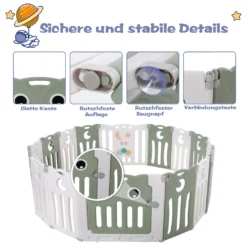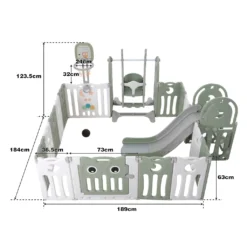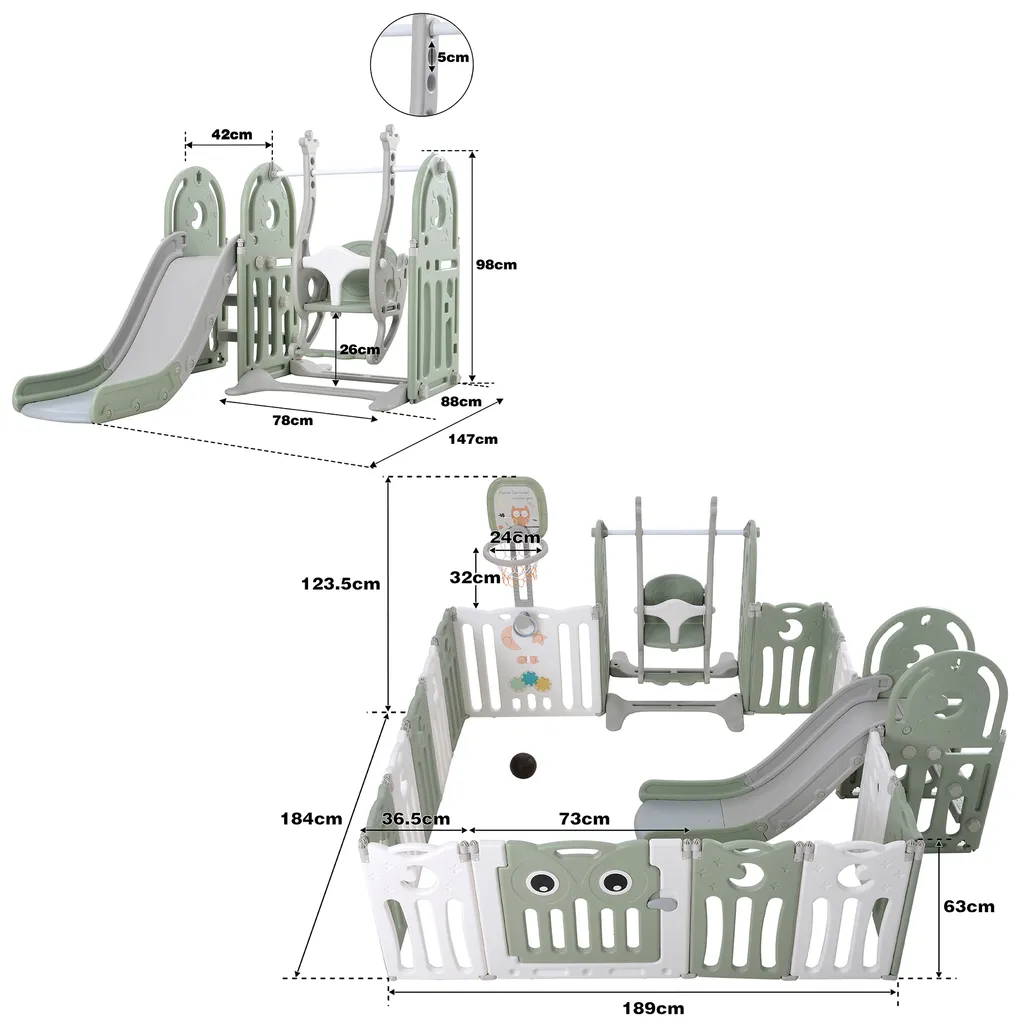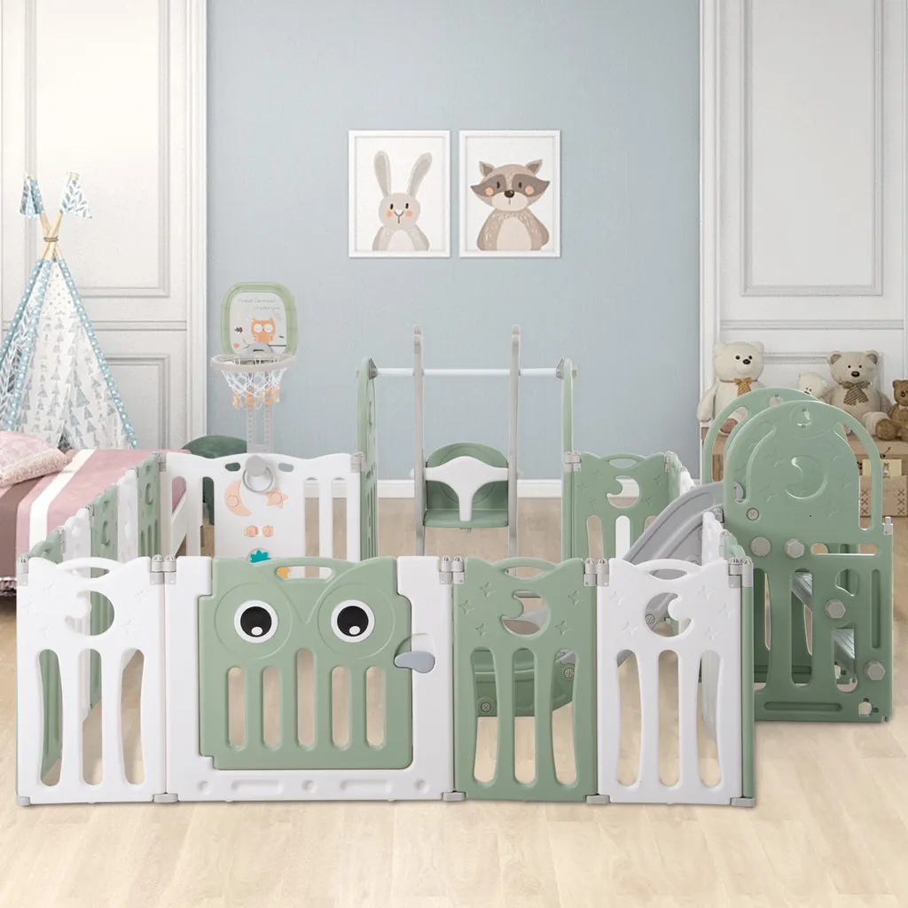 Merax Laufgitter Faltbar Laufstall Baby Absperrgitter 14+2 Paneele Schutzgitter Mit Schaukel, Rutsche, Basketballkorb Und BB-Sound-Knopf, Krabbelgitter Aus Kunststoff Für Kinder, Grün+ Weiß