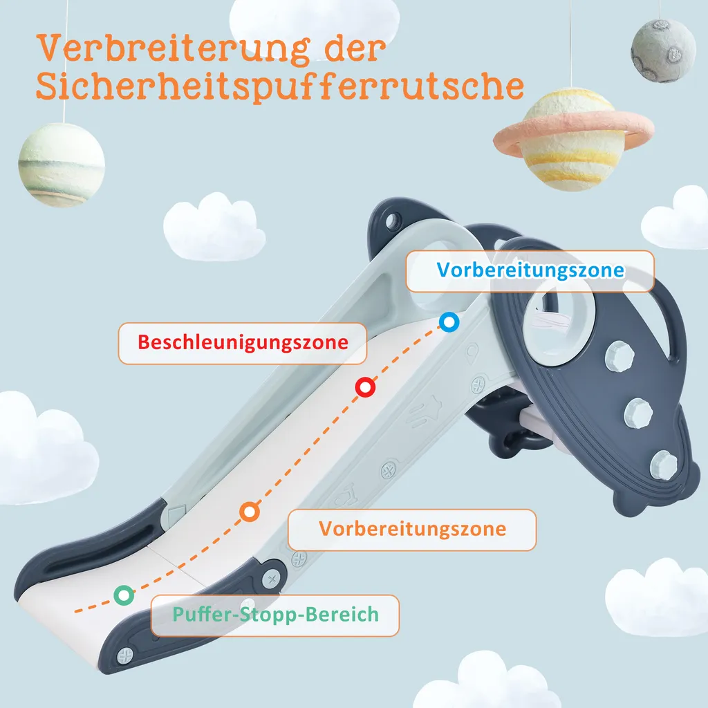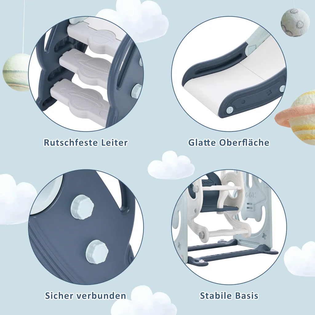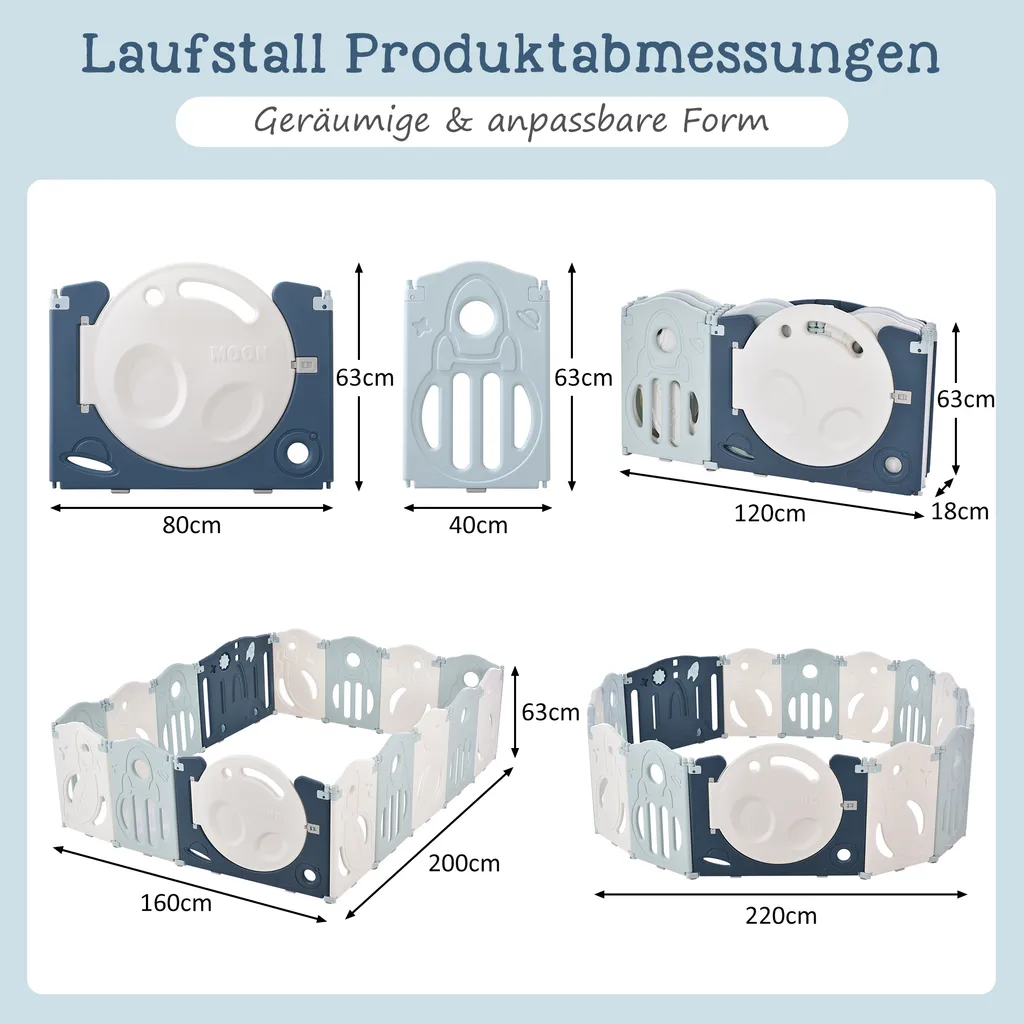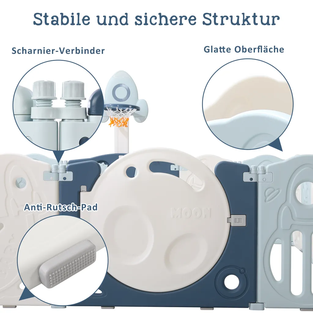 Merax Laufgitter Faltbar Laufstall Baby Absperrgitter 14+2 Paneele Schutzgitter Mit Schaukel, Rutsche Und Basketballkorb, Astronauten-Serie Krabbelgitter 4-in-1 Laufgitter Für Kinder, Blau