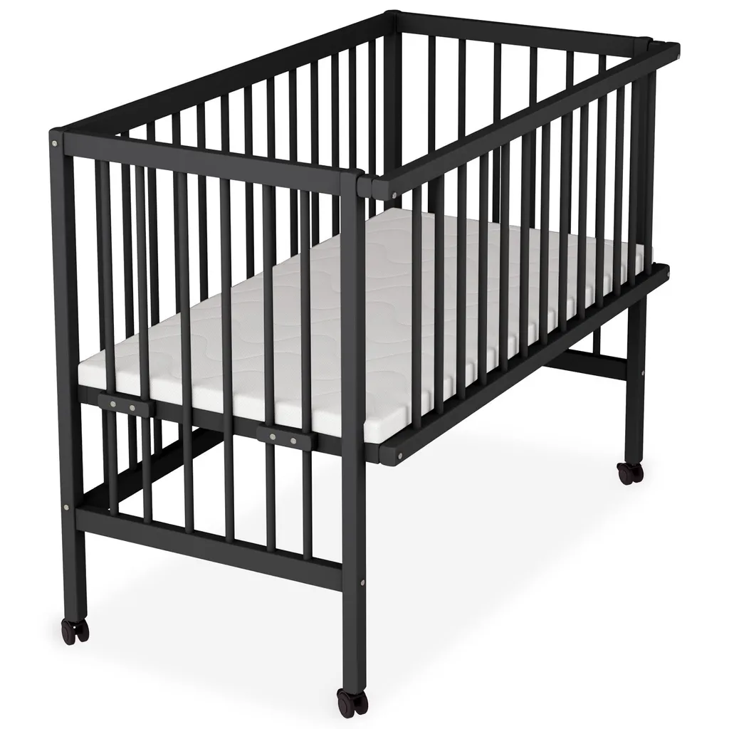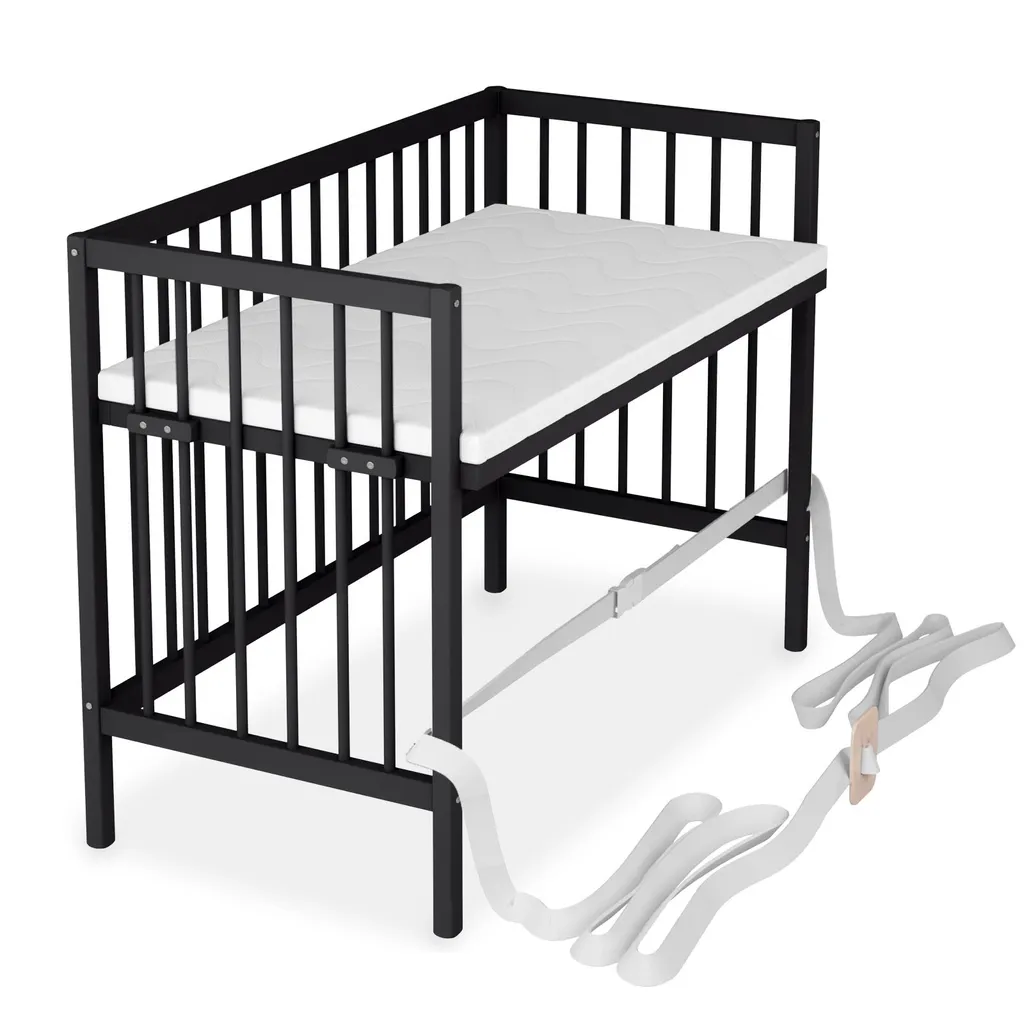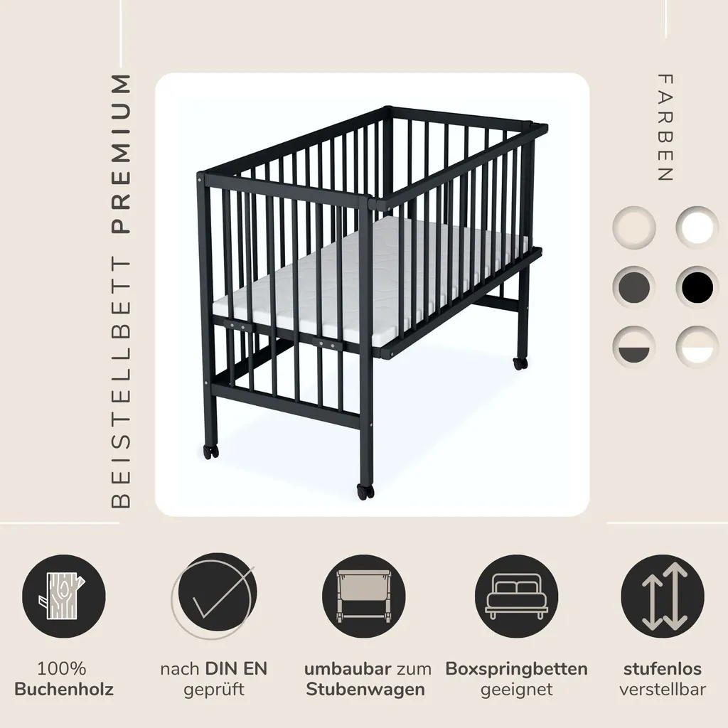 Sämann Beistellbett Premium 90×55 Cm Mit Matratze, Schwarz 4 In 1 Umbaubar Mit Umbauseite