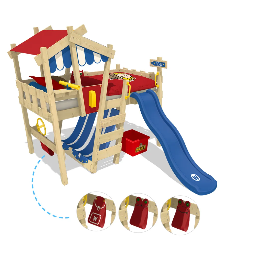 | Zusätzliche Varianten | WICKEY Kinderbett Hochbett CrAzY Hutty mit Rutsche Hausbett 90 x 200 cm, Etagenbett – blau, WICKEY Kinderbett Hochbett CrAzY Hutty mit Rutsche Hausbett 90 x 200 cm, Etagenbett – rot |